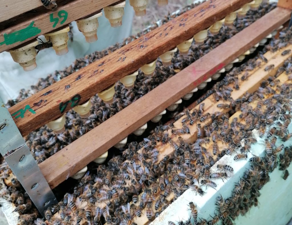 Les larves sont ensuite confiées à des ruches éleveuses, c’est à dire un ensemble d’abeilles privées de reine. Ces abeilles vont donc chercher à en élever une nouvelle, et utiliser les larves que nous leur proposons pour le faire. Sur la photo, il y a plusieurs barrettes contenant plusieurs cupules, avec une larve par cupule.
