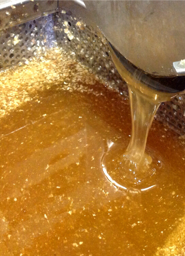 Le miel est récupéré à la sortie de la centrifugeuse. Il sera ensuite décanté et filtré plusieurs fois avant d’être conditionné, afin d’enlever les débris de cire, de propolis qu’il contient.